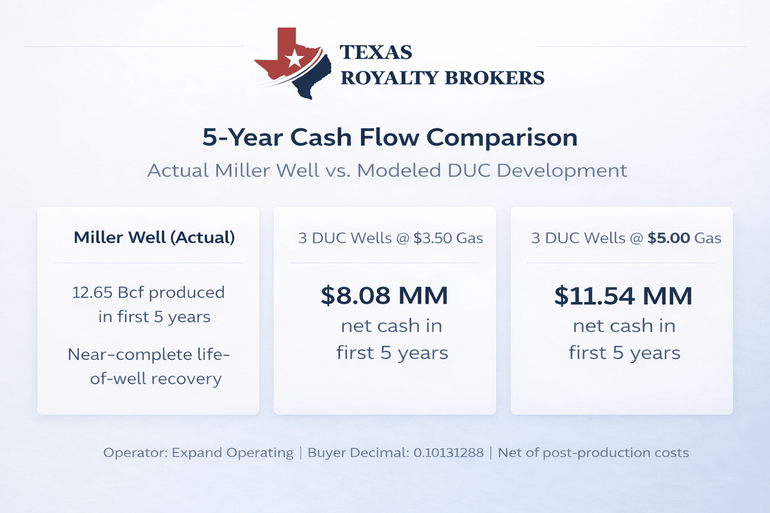 At $3.50 natural gas, the three DUC wells are estimated to generate approximately $8.1 million of net cash flow within the first five years.