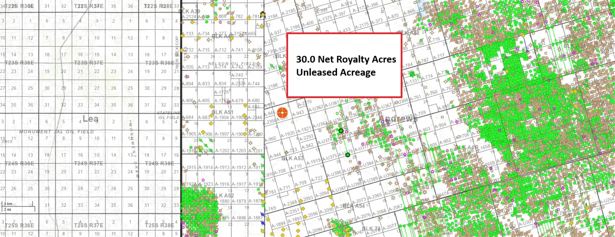 The seller has 30 NRA of ownership in Andrews County, Texas that is non-leased / non-producing.   This acreage has the least amount of activity in the surrounding area.  While this is a nice acreage position, this is likely a long term hold for the buyer.