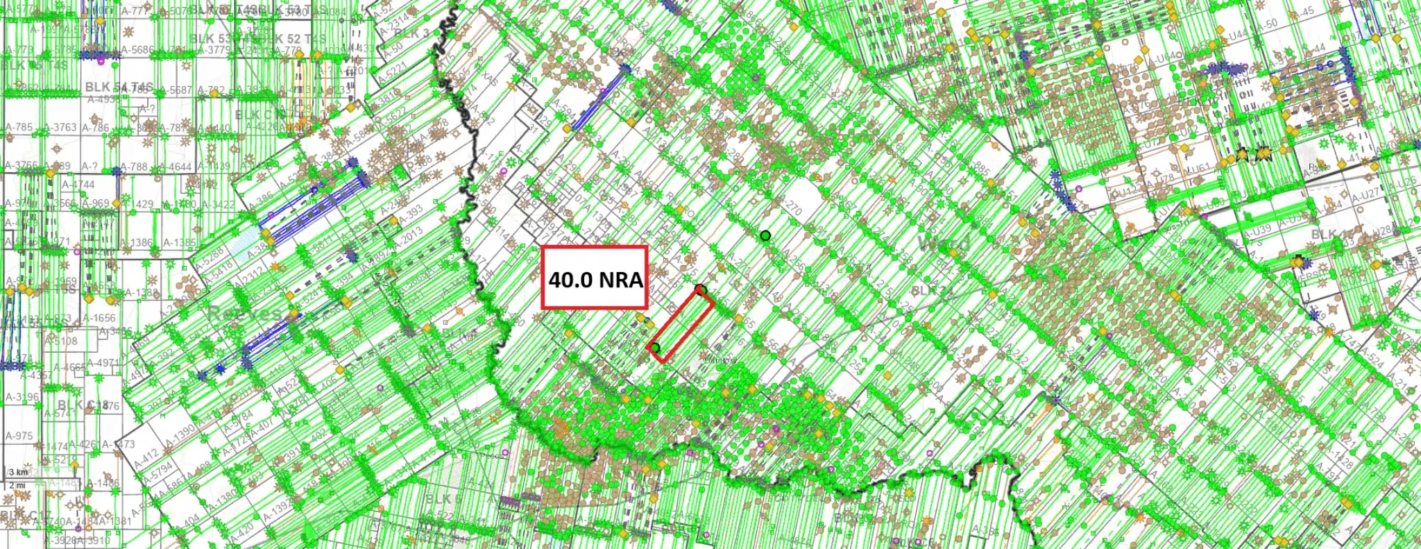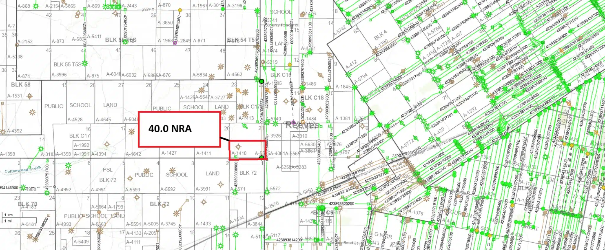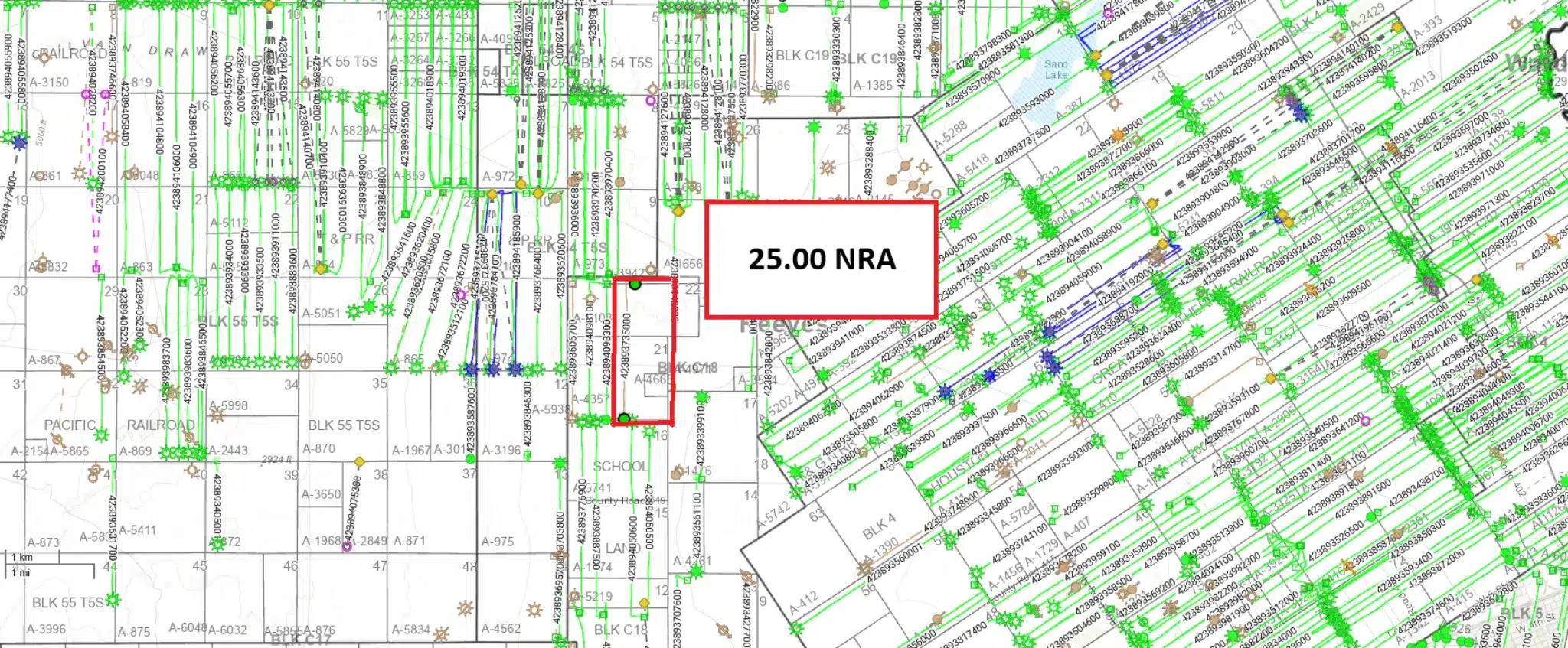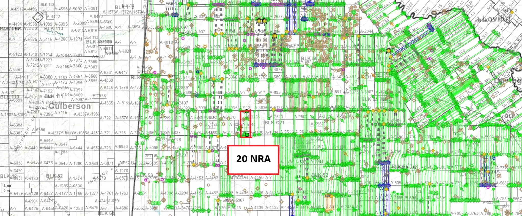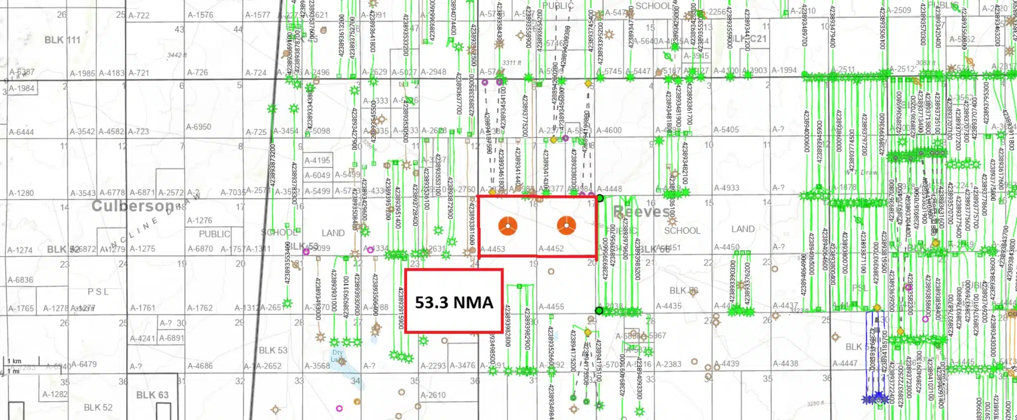 There are 53.3 NMA, or an assumed 106.67 NRA of open acreage in Reeves nearing the border of Culberson.  While this acreage is not currently leased, it is surrounded on all sides by production.  EOG operates a unit just West of this acreage called the Wapiti A Unit.  The Wapiti A 731H (4238939351), which directly borders this ownership, has generated about $35MM to $40MM in gross revenue at conservative oil and gas price estimates.