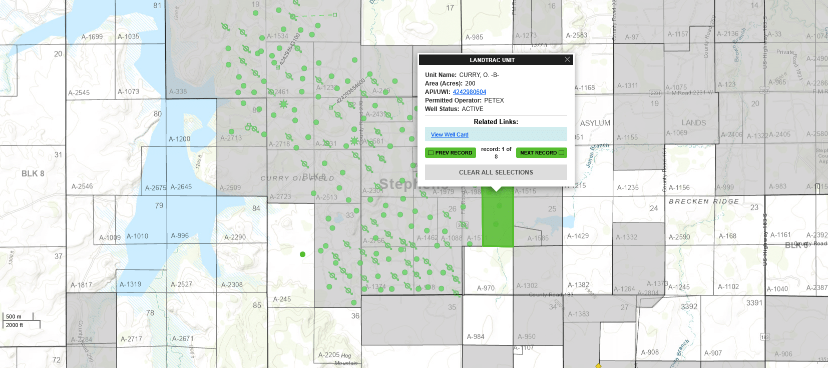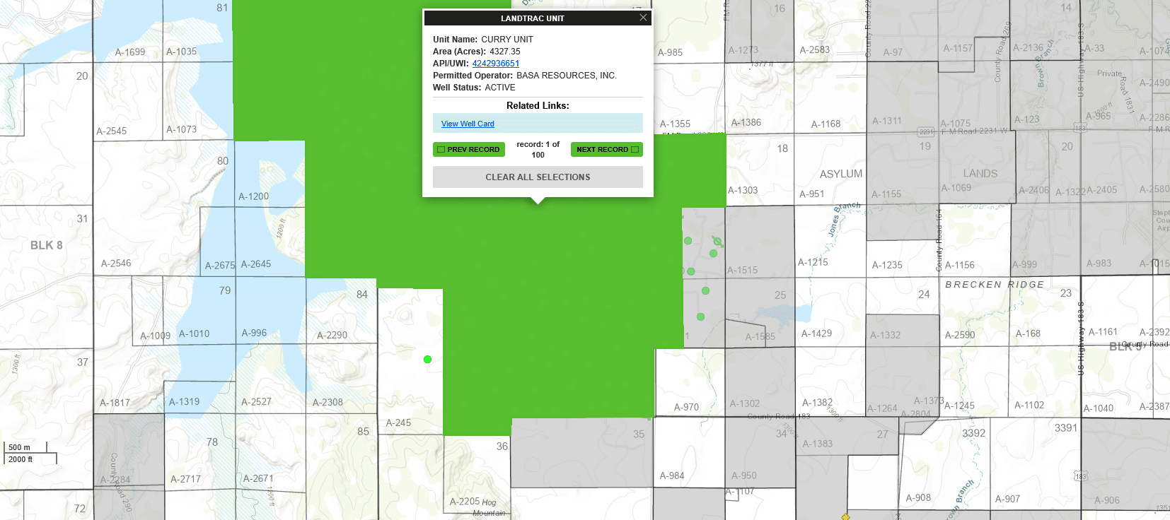 Within the OB Curry Unit, which covers approximately 200 acres, we believe our client owns 18.75 net royalty acres. The unit currently produces from five vertical oil wells. In addition to the OB Curry Unit, we believe our client owns additional mineral interests within the much larger Curry Super Unit, which spans approximately 4,327 acres. The exact location and net acreage within the super unit will need to be confirmed through title.